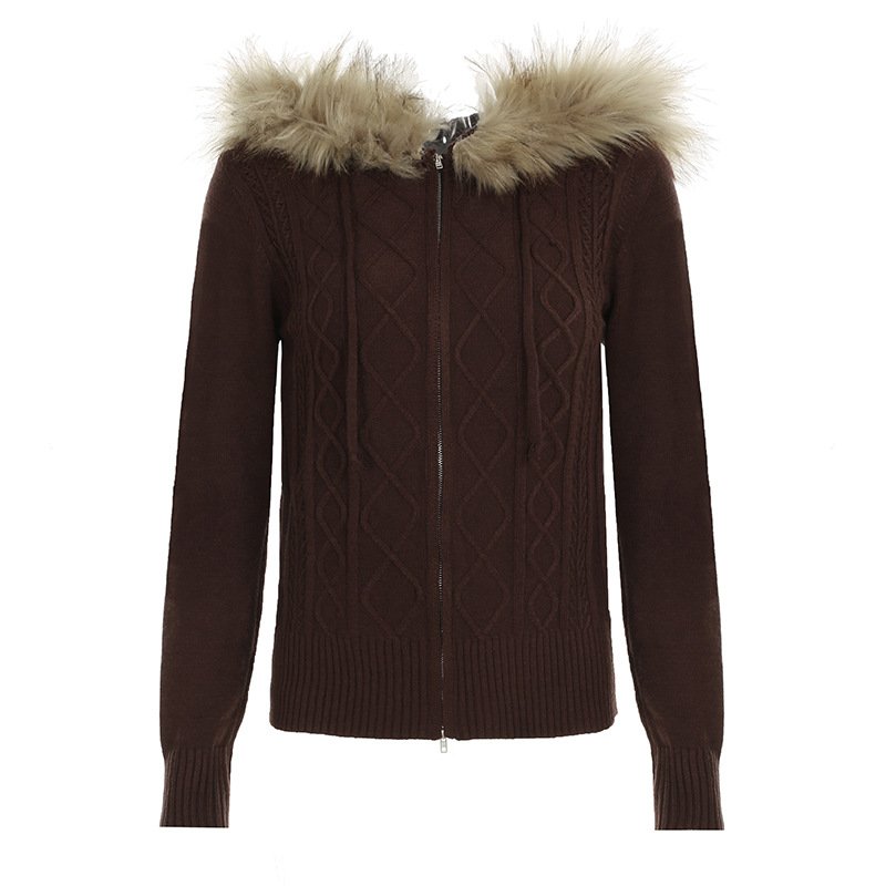 Retro Cable Knit Zipper Cardigan Sweater Slim Spicy Girl Warm Fuzzy Hooded Jacket
