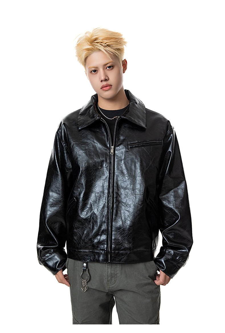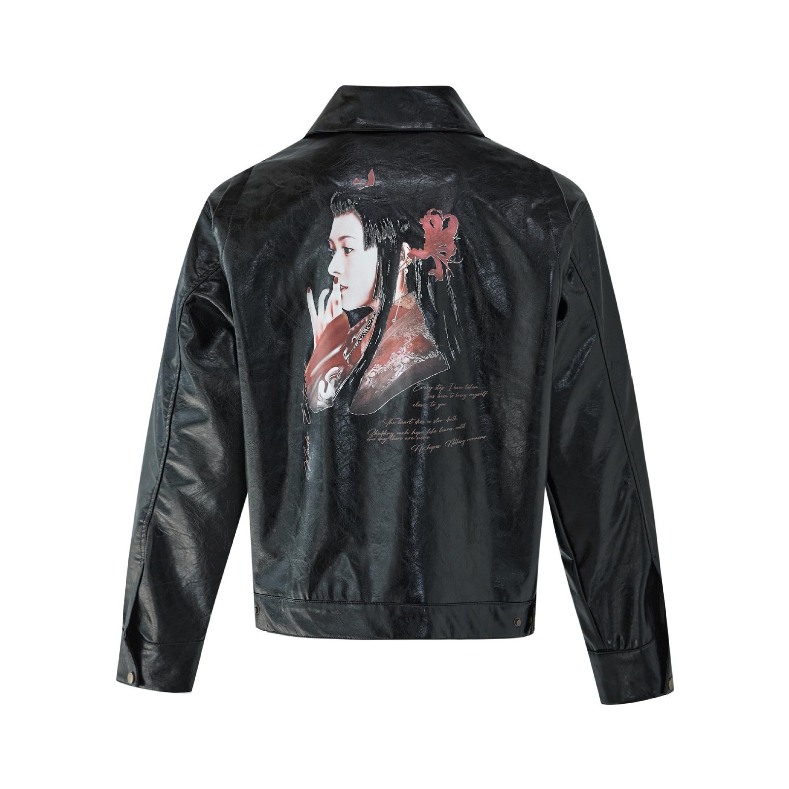 Be the first to review “Men’s Oil Wax UV Printed Portrait Collar Pleated Aged PU Leather Jacket”