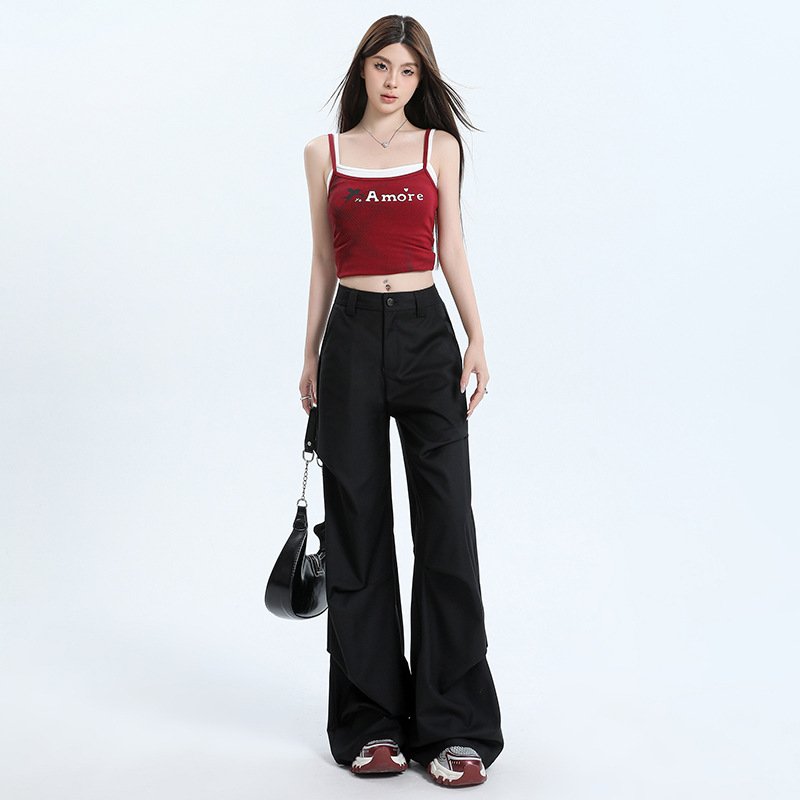 Women’s Wide-Leg Denim Trousers with Fringe Craft Low Waist Slim Floor-Length Pants